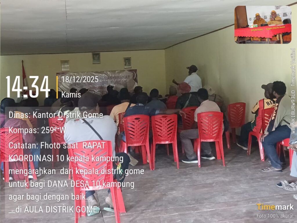 Ilaga, metronoken.id – Arahkan 10 Kepala Kampung Tingkatkan Koordinasi dan Transparansi Pengelolaan Anggaran di setiap Kepala agar tepat sasaran terhadap Masyarakat. Kepala Distrik Gome, Agustinus Murib, S.IP, memimpin pertemuan koordinasi bersama 10 kepala kampung di wilayah Gome untuk membahas penyaluran Dana Desa menjelang perayaan Natal. Kegiatan ini berlangsung di Aula Pertemuan Masyarakat Gome, Kamis (18/12/2025) pukul 14.34 WIT.