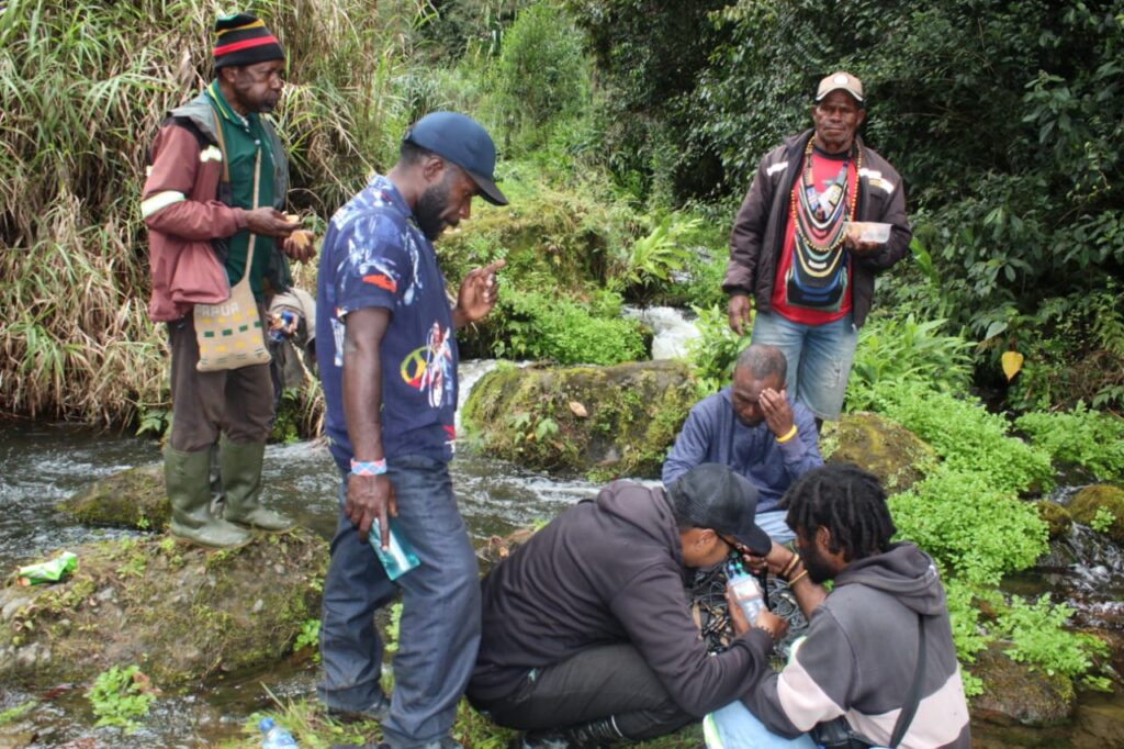 Tim peneliti bersama Kepala Distrik Gome berada di sungai kulem, Tim mengambil sampel sedang melakukan pencobaan. (Dok. Opien Murib)